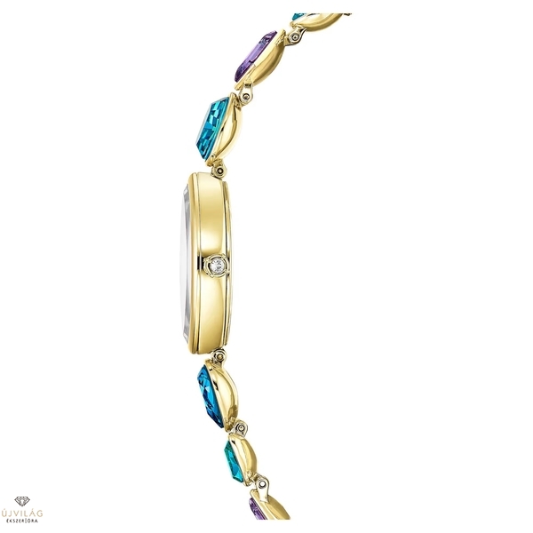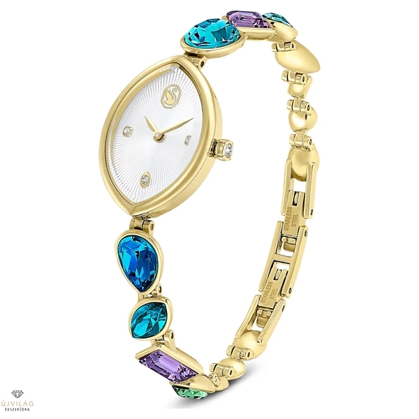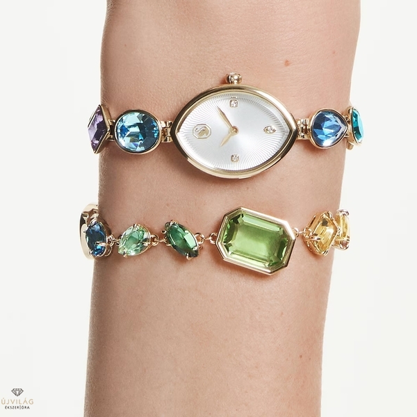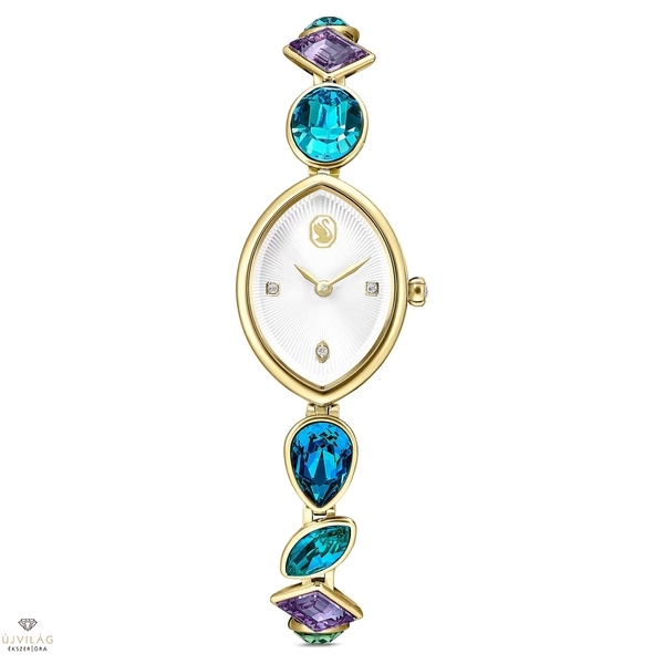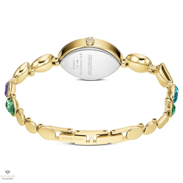 A formák magával ragadó ütközésével ez a Swarovski óra a Gema ékszerkollekcióból merít ihletet. A mandula formájú óraház rozsdamentes acélból készült, arany tónusú bevonattal, és guilloché számlappal, három kristálybeosztással és elegáns hattyú emblémával rendelkezik. Az óra karkötője a csukló méretéhez igazítható, és nyolc különböző metszésű és színű kristály díszíti. Az 50 méterig vízálló óra játékos módon visz ragyogó geometrikus stílust megjelenésébe.