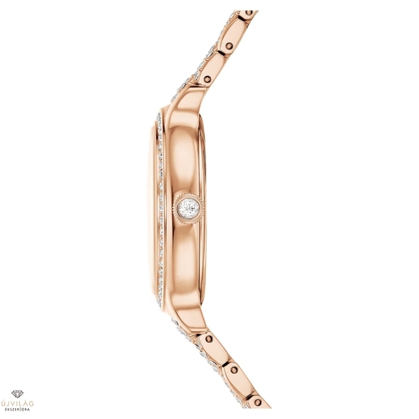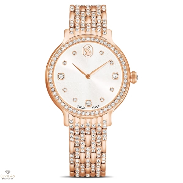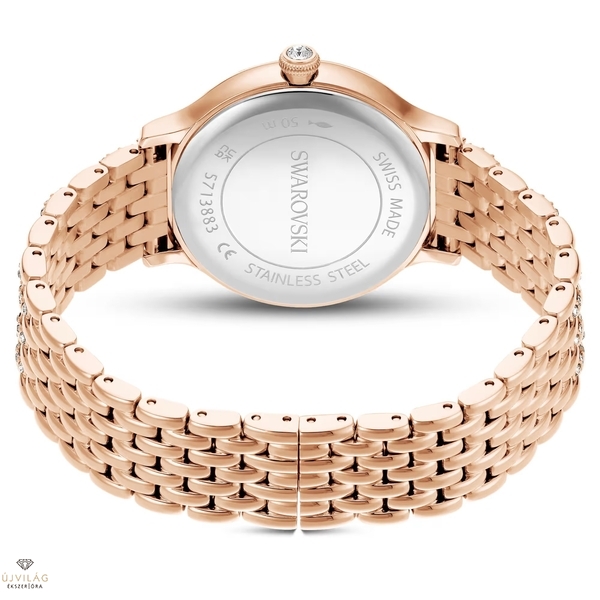 A 232 különálló kristállyal díszített, tündöklő Imber óra a Swarovski időtlen eleganciájának legkifinomultabb kifejeződése. A 31 mm-es, rózsaarany-tónusú bevonattal ellátott rozsdamentes acél óraházat 52 átlátszó kristállyal kirakott pavéberakás, a koronát pedig egy további kristály díszíti. A napsugaras számlapon 11 különböző méretű kristály jelzi az órákat, 12 óránál pedig a hattyú embléma látható. Az óra legjellegzetesebb vonása a csuklót körbeölelő hétszemes karkötő, amelyet 168 kerek metszésű kristály varázsol ragyogóvá. Ez a svájci gyártmányú óra 50 méterig vízálló, és tökéletesen illik a Swarovski Imber ékszerkollekciójához. Óraház mérete: 31 x 31 mm. Óraház vastagsága: 8 mm. Óraszíj hossza (min. - max.): 14.3 - 16.6 cm. Óraszíj szélessége: 14 mm.