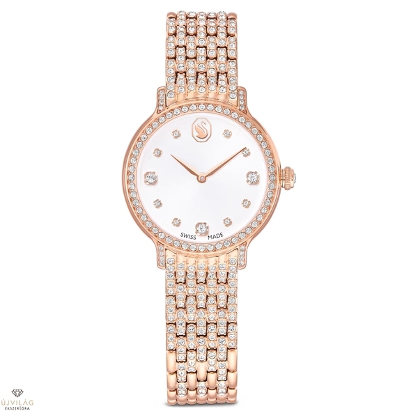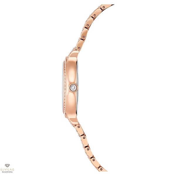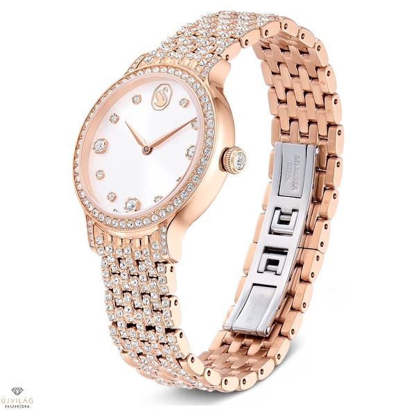 Ez a 31 mm-es óra rozsdamentes acélból készült, rózsaarany tónusú bevonattal, és az Imber ékszercsaládra jellemző fém- és kristályfúzió ihlette. A pavéberakásos lünettát 68 különálló kristály díszíti, míg további 198 kristály ékesíti a hét láncszemes karkötőt. A napsugaras számlapon kristállyal díszített beosztások, valamint a 12 óránál elhelyezett finom hattyú embléma gondoskodik az extra ragyogásról. Ez a svájci gyártmányú, 50 méterig vízálló óra a csillogás megtestesítője. Óraház mérete: 31 x 31 mm. Óraház vastagsága: 8 mm. Óraszíj hossza (min. - max.): 14.3 - 18.5 cm. Óraszíj szélessége: 14 mm.