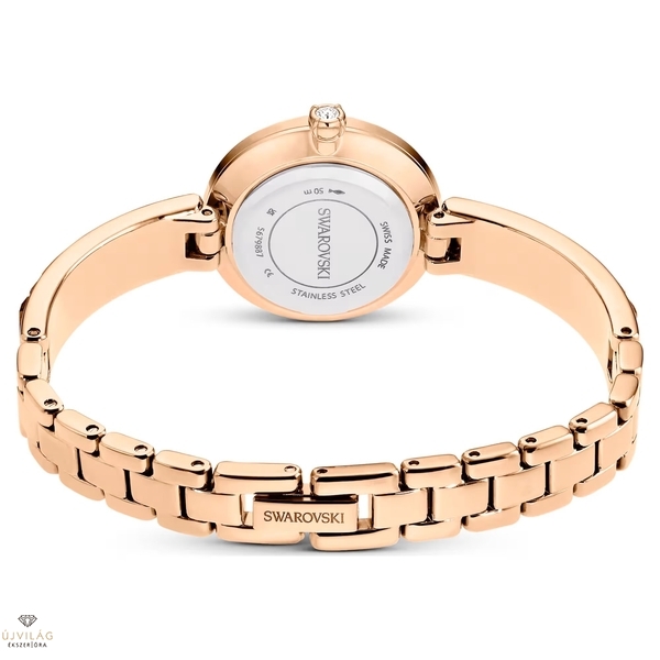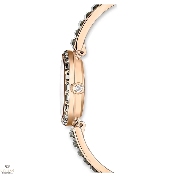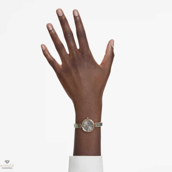Ez a csodás, ékszerek által ihletett karóra maga a kristályokkal hangsúlyossá tett elegancia. A 25 mm-es, rozsdamentes acél kialakítás rózsaarany árnyalatú bevonatot kapott, a lünettát 20 baguette metszésű, sötétszürke kristály díszíti, a felhúzó koronán pedig egyetlen kristály tündököl. A sötétszürke számlapot három, baguette metszésű kristállyal készült beosztás és 12 óránál egy hattyú emblémája ékesíti. A csuklót körülölelő, karperecstílusú fémszíjat 16 baguette metszésű kristály díszíti, és a kényelmes illeszkedés érdekében teljes mértékben állítható. A svájci gyártmányú óra 50 méterig vízálló, és ideális kiegészítőként az élet minden pillanatát beragyogja. Tok mérete: 25 mm x 25 mm. Óraszíj hossza: 16,5 cm.