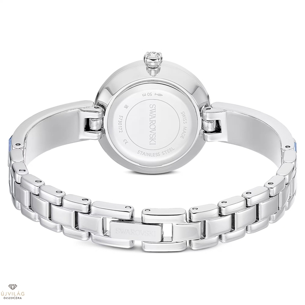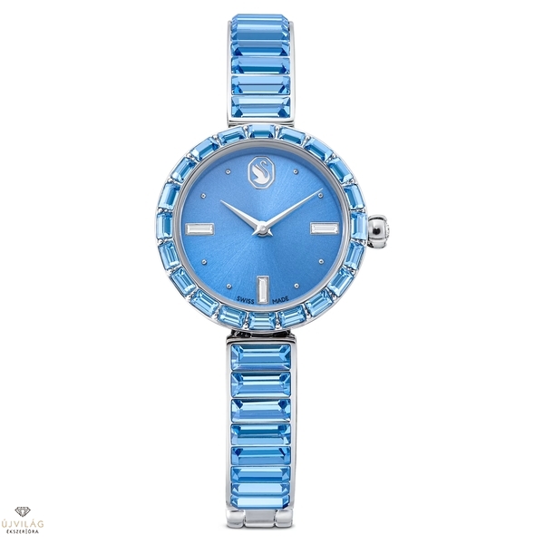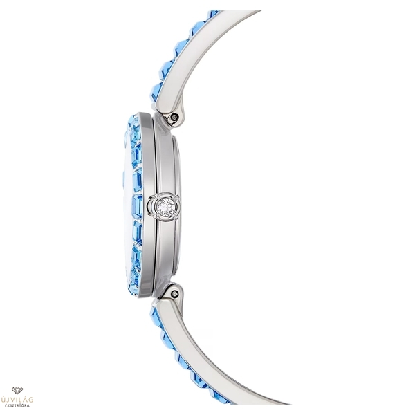 Kristályok fokozzák az eleganciáját ennek a gyönyörű, ékszer ihlette órának. A 25 mm-es rozsdamentes acél darab középpontjában egy 20 baguette metszésű, kék Swarovski ReCreated™ kristály által övezett lünetta áll, a felhúzó koronát pedig egy kristály ékesíti. Baguette metszésű kristályok emelik ki a három beosztást a kék számlapon, amelyen 12 óránál egy hattyú embléma látható. A csuklórészen a karperec stílusú karkötőt 16 baguette metszésű Swarovski ReCreated™ kék kristály díszíti, és teljesen állítható a kényelmes illeszkedés érdekében. A svájci gyártmányú óra 50 méterig vízálló, és ideális kiegészítő az igéző stílus megteremtéséhez. Óraház mérete: 25 x 25 mm. Óraház vastagsága: 7 mm. Óraszíj hossza (min. - max.): 13 - 19 cm. Óraszíj szélessége: 0.9 cm.