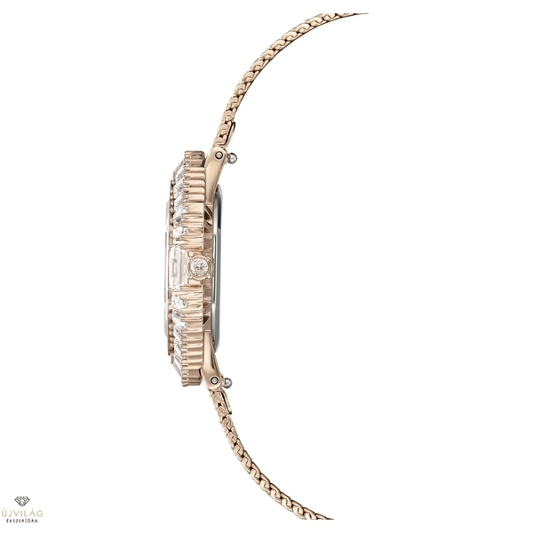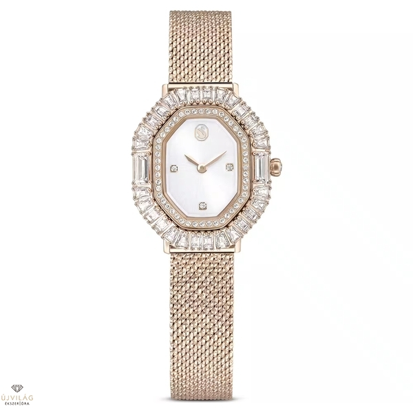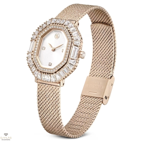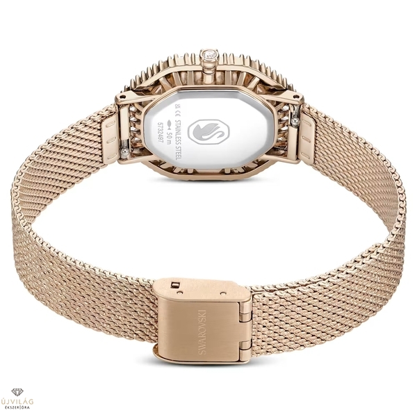 Ez az innovatív óra egyedülálló alkotás, amely az ikonikus dizájnt a fény terén szerzett szakértelemmel ötvözi. A valódi savoir-faire-rel megalkotott órát a Matrix ékszercsalád ihlette, és 13 x 18 mm-es, pezsgőarany-tónusú rozsdamentes acél óraházzal rendelkezik. A lünetta a Swarovski jellegzetes nyolcszög formáját kapta, és 78 kerek, illetve elegáns metszésű kristály, valamint Swarovski Zirconia díszíti. Mindez ragyogó keretet ad a minimalista, napsugaras csiszolású számlapnak, amelyen elegánsan helyezkedik el a három kristály órabeosztás és a hattyú logó. A koronában is látható egy kristály, míg a csuklón az állítható hálós óraszíj fokozza a luxus érzetét. Az 50 méterig vízálló óra a Swarovski által képviselt modern luxust testesíti meg. Méretek: Óraház mérete: 30 x 25 mm. Óraház vastagsága: 7 mm. Óraszíj hossza (min. - max.): 12.5 - 19 cm. Óraszíj szélessége: 1.2 cm