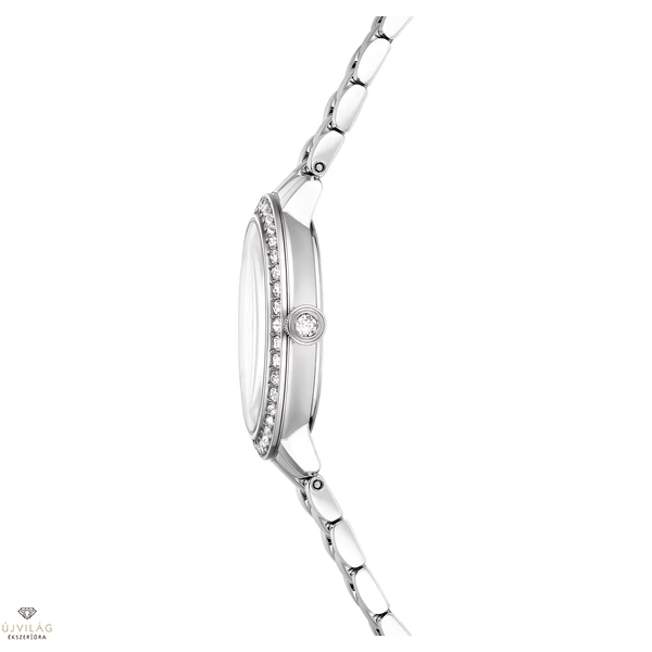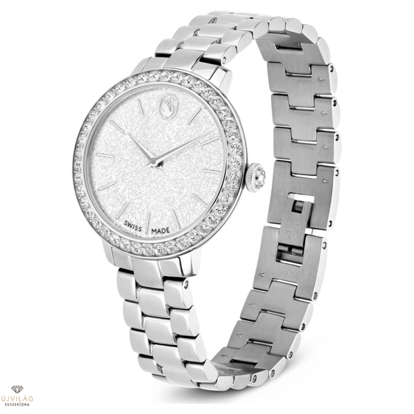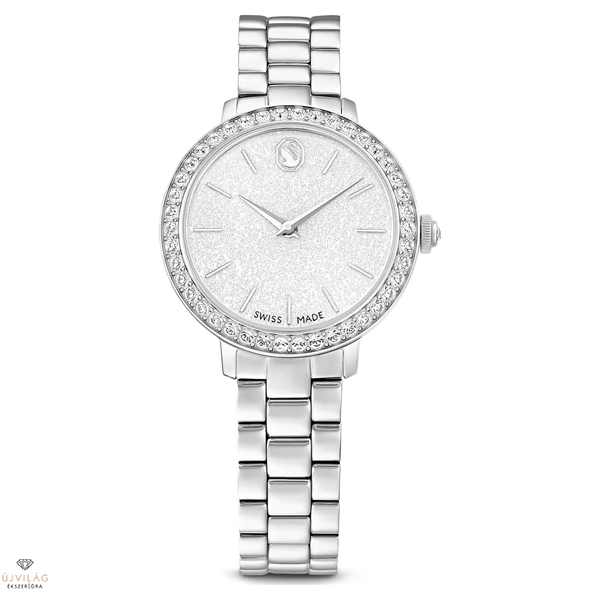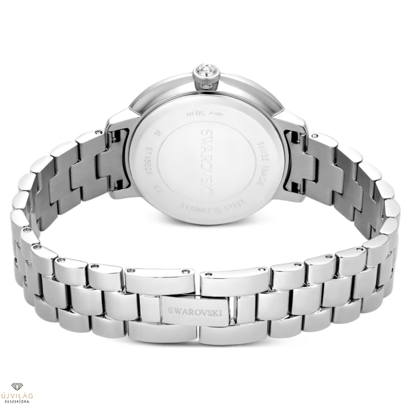 A Swarovski Matrix ékszerek által ihlettet, 30 mm-es óra ugyanazt a kortárs és kifejező stílust testesíti meg. A rozsdamentes acélból készült óra 42 kristályból álló pavé foglalatú bezelszettel díszített, míg a gyönyörű, kerek számlap csillogó hatású, karcsú órajelölőkkel és mutatókkal, valamint 12 óránál egy hattyúlogóval ellátott. A felhúzó koronába foglalt plusz kristály mellett az óra további különlegessége a háromszemes karkötő, amely elegánsan körbeöleli a csuklót. A svájci gyártmányú óra 50 méterig vízálló, és tökéletes kiegészítő bármilyen alkalomra. Méretek: Óraház mérete: 30 x 30 mm. Óraház vastagsága: 7 mm. Óraszíj hossza (min. - max.): 12.5 - 19 cm. Óraszíj szélessége: 1.2 cm
