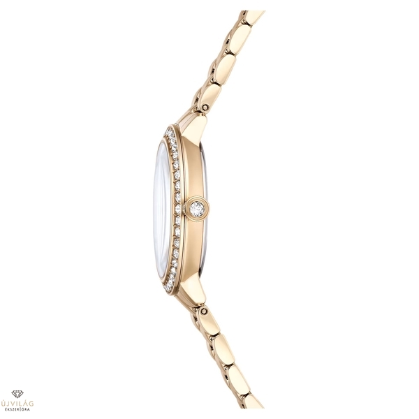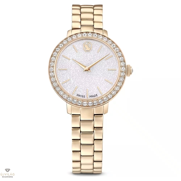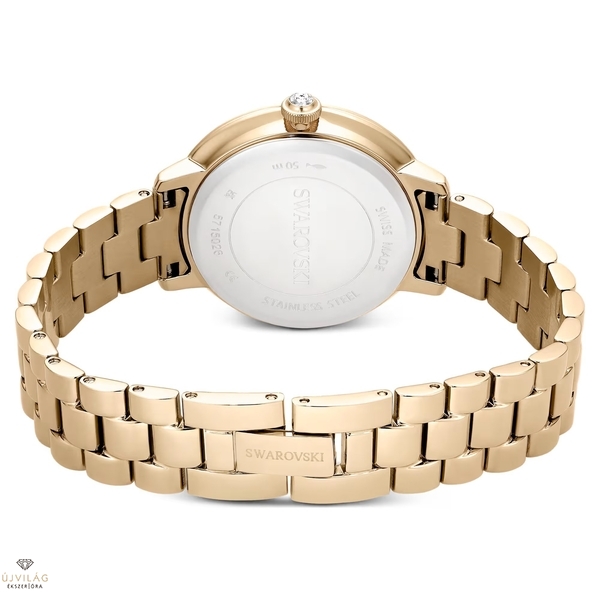 A Swarovski Matrix ékszerek által ihlettet, 30 mm-es óra ugyanazt a kortárs és kifejező stílust testesíti meg. A rozsdamentes acélból készült óra pezsgőarany-tónusú bevonattal rendelkezik, és 42 kristályból álló pavé foglalatú bezelszettel díszített. A gyönyörű, kerek számlap csillogó hatású, karcsú órajelölőkkel és mutatókkal, valamint 12 óránál egy hattyúlogóval ellátott. A felhúzó koronába foglalt plusz kristály mellett az óra további különlegessége a háromszemes karkötő, amely elegánsan körbeöleli a csuklót. A svájci gyártmányú óra 50 méterig vízálló, és tökéletes kiegészítő bármilyen alkalomra. Méretek: Óraház mérete: 30 x 30 mm. Óraház vastagsága: 7 mm. Óraszíj hossza (min. - max.): 12.5 - 19 cm. Óraszíj szélessége: 1.2 cm