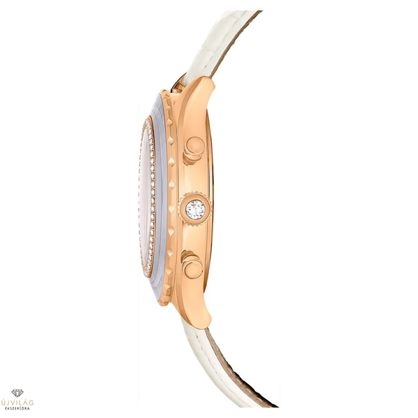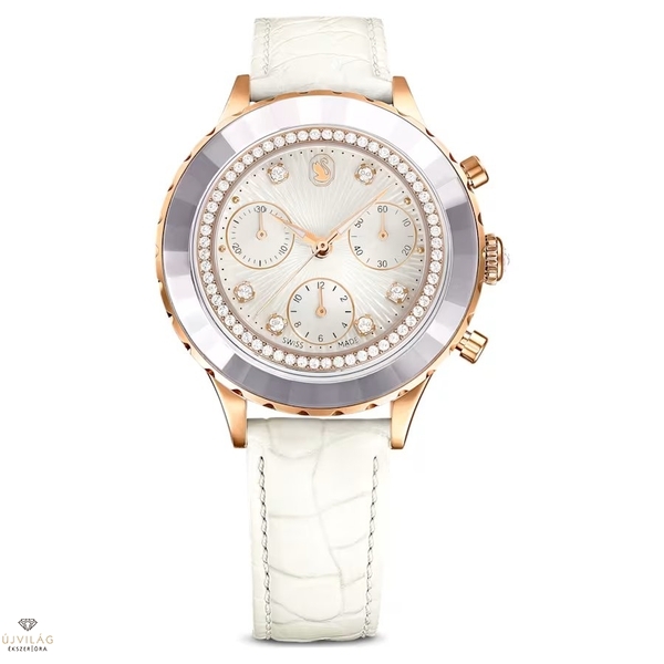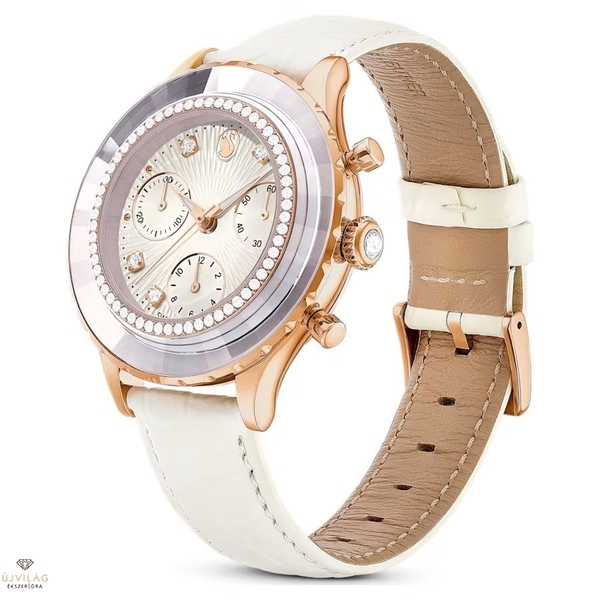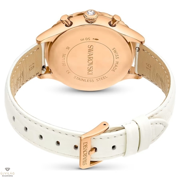 Ez az elefántcsont színű kronográf óra az órakészítési szakértelem és a Swarovski-féle savoir-faire tökéletes elegye. A rózsaarany-tónusú bevonattal ellátott, kerek, 37 mm-es óraház jellegzetes kristályos lünettája kifinomultan fazettált, és körben átlátszó pavéberakás díszíti. Az ásványi üveg alatt található guilloché számlapon 12 óránál a hattyú emblémája látható, az óramutatók LumiNova borításúak, a három kronográfszámláló pedig az óra, a perc és a másodperc külön mérésére szolgál. A beosztásokat hat átlátszó kristály, a felhúzókoronát pedig egyetlen kristály díszíti. Ez a svájci gyártmányú óra 50 m-ig vízálló, és elefántcsontszínű, dombornyomott krokodilbőr mintájú, gyorszáras, olasz borjúbőr szíj tartozik hozzá. Tok mérete: 42.6 mm x 37 mm, Óraszíj hossza: 16 cm