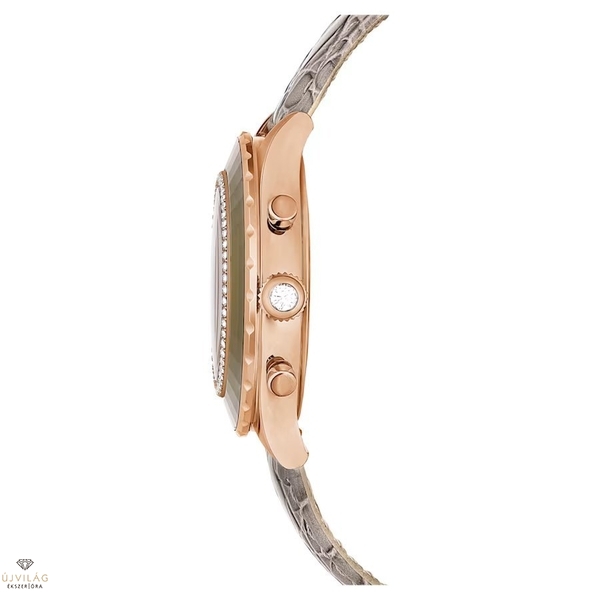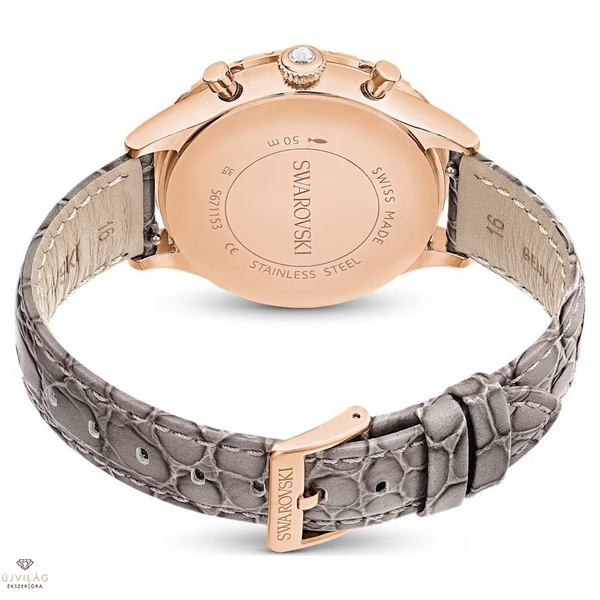 Ez a szürke kronográf óra az órakészítési szakértelem és a Swarovski-féle savoir-faire tökéletes elegye. A rózsaarany-tónusú bevonattal ellátott, kerek, 37 mm-es óraház kristályos lünettája kifinomultan fazettált, és körben átlátszó pavéberakás díszíti. Az ásványi üveg alatt található guilloché számlapon 12 óránál a hattyú emblémája látható, az óramutatók LumiNova borításúak, a három kronográfszámláló pedig az óra, a perc és a másodperc külön mérésére szolgál. A beosztásokat hat átlátszó kristály, a felhúzókoronát pedig egyetlen kristály díszíti. Ez a svájci gyártmányú óra 50 m-ig vízálló, és barna, dombornyomott krokodilbőr mintájú, gyorszáras, olasz borjúbőr szíj tartozik hozzá. Tok mérete: 42.6 mm x 37 mm, Óraszíj hossza: 16 cm