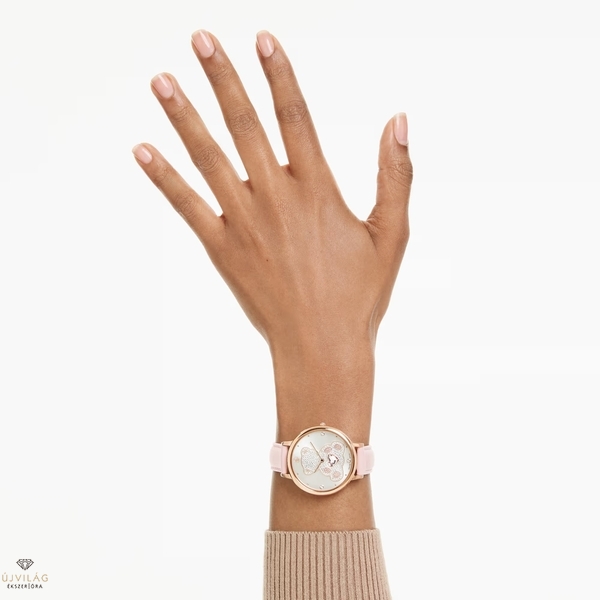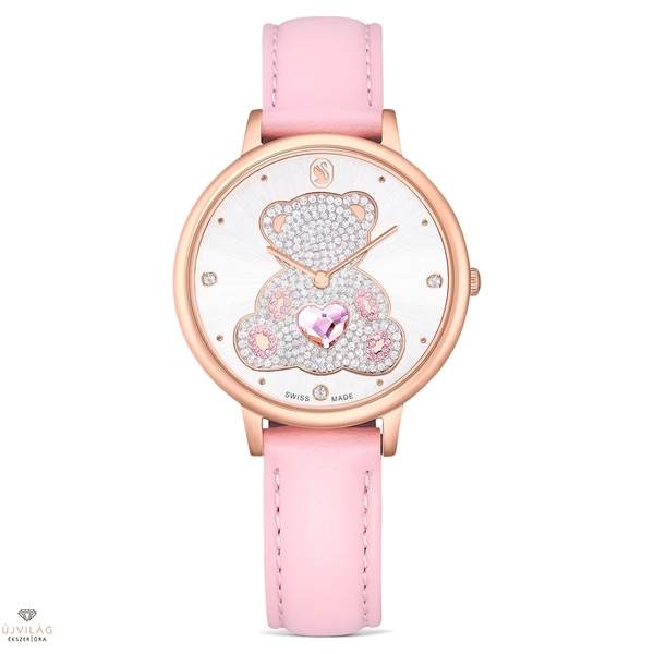 A játékos, ártatlan csodát sugárzó Swarovski Teddy óra imádni való részletekkel ragyog. A 35 mm-es óraház rozsdamentes acélból készült, rózsaarany tónusú bevonattal, míg a világos rózsaszín bőrszíj élénk színbe öltözteti a csuklót. A napsugaras számlapon a beosztásokat egy mackómotívum kíséri, amelyet több mint 240 kristály, egy rózsaszín szív alakú középrész és rózsaarany tónusú bevonattal ellátott tappancsok díszítenek a még bájosabb összhatás érdekében. Ez a svájci gyártmányú óra 50 méterig vízálló, és vidám hangulattal szövi át stílusát.