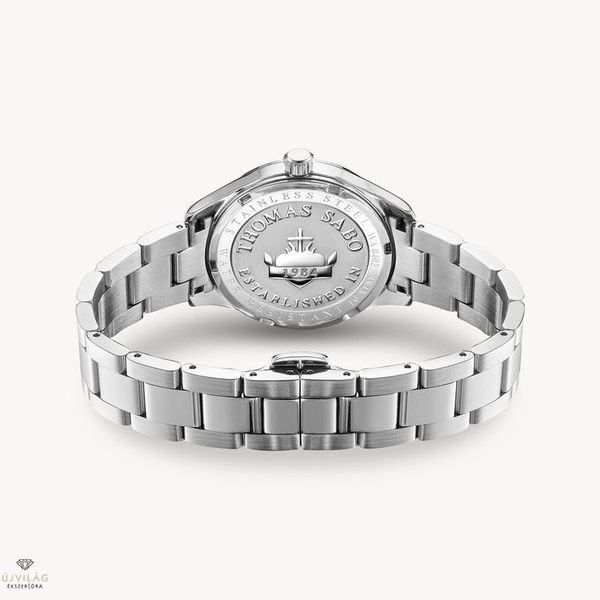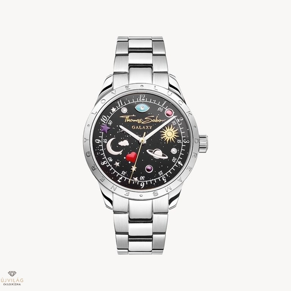 Kozmikus számlappal ellátott karóra: a fekete számlap kifinomult kialakítása ennek az uniszex karórának a legfőbb jellemzője. A számlapon csiszolt kozmikus szerencseszimbólumok láthatók, mint például a hold, a csillagok, a nap, egy szem és egy szív. A dombornyomott részletek egy része kézzel festett, piros, kék és lila hideg zománccal, más része pedig kézzel behelyezett fehér cirkóniakövekkel díszített. A „THOMAS SABO Galaxy” felirat is dombornyomott kivitelben jelenik meg. Különleges kiemelésként a másodpercmutató egy kis csillaggal van díszítve. Ezenkívül a mutatók lumineszcens anyagból készültek, és sötétben világítanak.