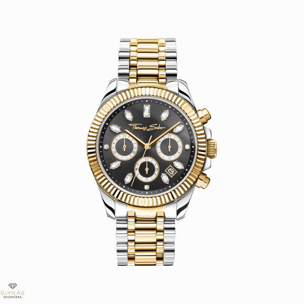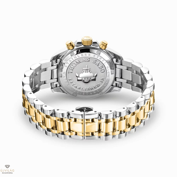 Divine Chrono: a tok és az óra elegáns, két színű láncszemű karkötője rozsdamentes acélból készült. Az ezüst és sárga arany színek, a fekete számlap, a sárga arany színű mutatók és a bordázott lunetta hangsúlyozzák az óra elegáns és modern kialakítását. A mutatóként szolgáló, kézzel behelyezett fehér cirkóniakövek teszik ezt az órát egyedülállóvá. Elegáns láncszemű karkötőjével, edzett, tükröződésmentes, zafírbevonatú ásványi üvegével, 24 órás kijelzőjével, stop funkciójával és dátumkijelzőjével ez a kronográf ideális mindennapi viseletre. Összecsukható kapcsának köszönhetően a rozsdamentes acél karkötő kényelmesen öleli körül a csuklót. A Divine Chrono sorozat tökéletesen kiegészíti a THOMAS SABO órakollekciót.