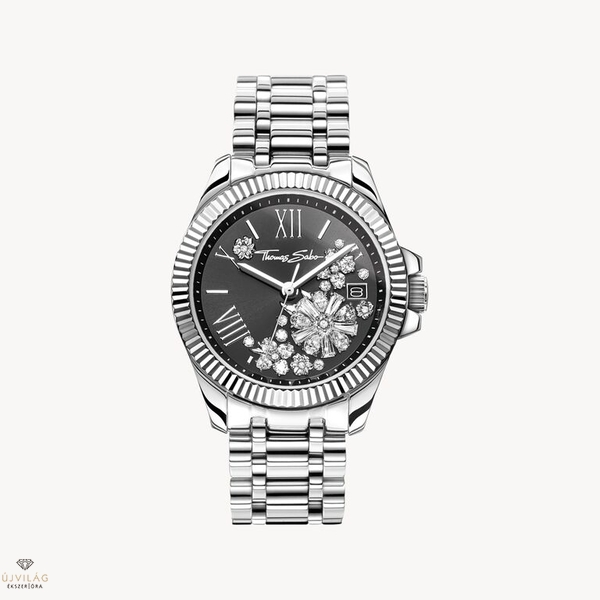 Ez a THOMAS SABO női karóra a DIVINE karóra kollekciónk különleges kiadása, a jellegzetes fekete és ezüst színkóddal. A DIVINE FLOWER csillogó, fehér virágokkal vonzza mindenki figyelmét a fekete, napfényes felületű számlapra. Különböző csiszolású fehér cirkóniakövek alkotják a finom virágokat. A római számok jelzik az időt, és klasszikus megjelenést kölcsönöznek a kialakításnak, akárcsak az egyszerű mutatók. Az óra 33 mm átmérőjű tokja és karkötője rozsdamentes acélból készült. A keretét barázdált megjelenése emeli ki, a koronát pedig a TS logó díszíti. Az egyes láncszemek eltávolíthatók, így az óra hossza könnyedén igazítható a csuklóhoz.