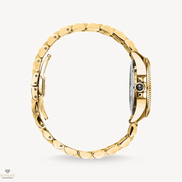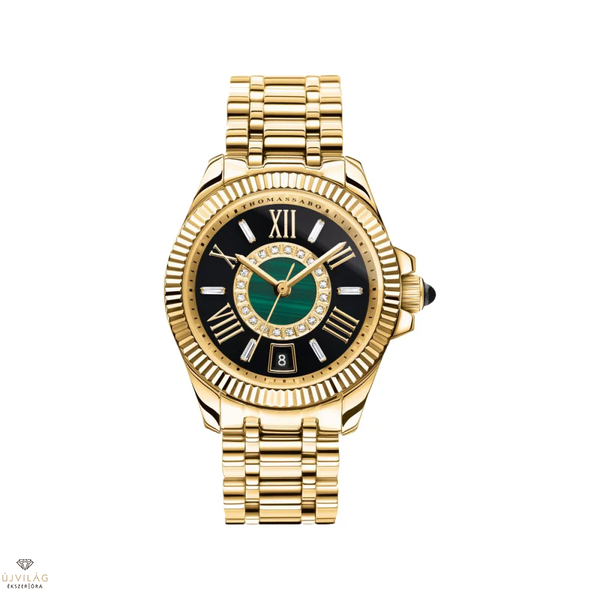 A Mystic Island kollekcióhoz hasonlóan ez az arany színű rozsdamentes acél óra is a múlt kincseiből és legendáiból merít ihletet. Az ókorra való utalást a római számok hangsúlyozzák, amelyek különösen elegánsak a kézzel behelyezett fehér cirkóniakövek között, kifinomult baguette és gyémánt csiszolással. A magasfényű fekete számlap közepén zöld malachit kő található, fehér cirkóniakövekkel. A dizájnt dátumkijelző és arany színű mutatók egészítik ki. A színpaletta is mélyebb jelentéssel bír, mivel az arany színű óra a föld mítoszait és legendáit szimbolizálja. A koronán található cabochon vágású fekete ónix teszi teljessé a megjelenést. A barázdált rozsdamentes acél szíj könnyen nyitható, hajtókás zárral rendelkezik.