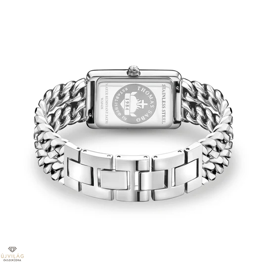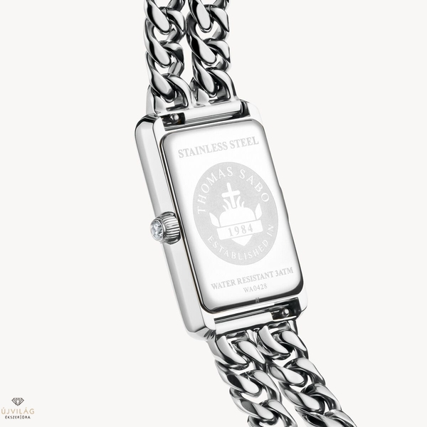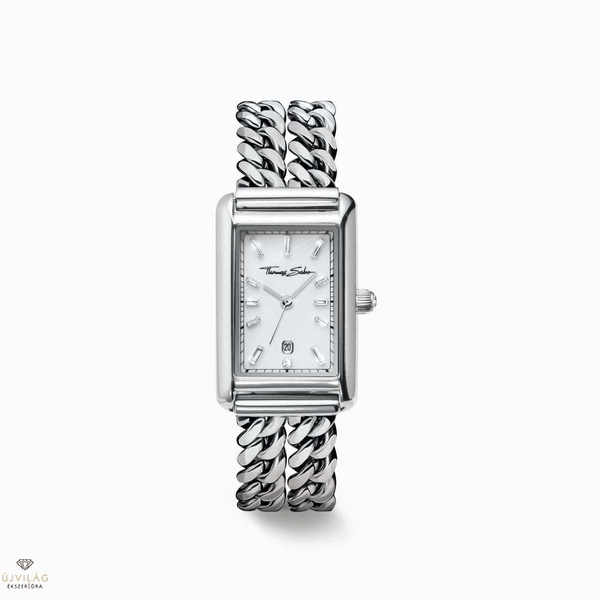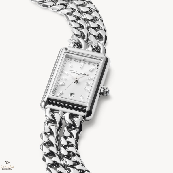 Ez a rozsdamentes acélból készült, téglalap alakú óra kétsoros láncszemes karkötővel elegáns megjelenést biztosít. Klasszikus, karcsú, fehér napsugár-fényű számlapján 12 fehér cirkóniakő található, amelyek klasszikus baguette és hercegnő csiszolásúak, és indexként szolgálnak. A korona fehér cirkóniakővel van kirakva, amely csillogóvá és ragyogóvá teszi. A 6. pozícióban található dátumkijelző tökéletessé teszi a hárommutatós óra ízléses kialakítását.