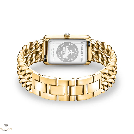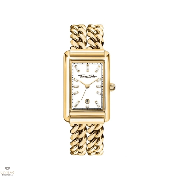 Ez a téglalap alakú, aranyszínű, rozsdamentes acélból készült, kétsoros láncszemes karkötővel ellátott óra elegáns viselet. Klasszikus, karcsú, fehér napsugár-fényezésű számlapján 12 fehér cirkóniakővel van kirakva, amelyek klasszikus baguette és hercegnő csiszolásúak és indexként szolgálnak. A korona fehér cirkóniakővel van kirakva, amely csillogóvá és ragyogóvá teszi. A 6. pozícióban található dátumkijelző tökéletessé teszi ennek a hárommutatós, aranyszínű órának az ízléses kialakítását.