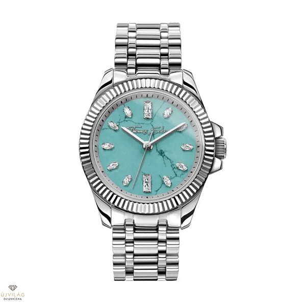 Ez az elegáns, rozsdamentes acélból készült hárommutatós óra türkizkék utánzatú számlapjával feltűnő látványt nyújt a csuklóján. Ennek a jellegzetes mintázatú kőutánzatnak köszönhetően ez az időmérő egyedi darab. A tizenkét kézzel beillesztett, baguette és marquise csiszolású fehér cirkóniakő indexként szolgál, és a türkiz divatszínnel együtt modern jelleget kölcsönöz ennek az órának. Az ezüstszínű mutatók, a fogazott lünetta és az elegáns karperec időtlen eleganciát sugároz.