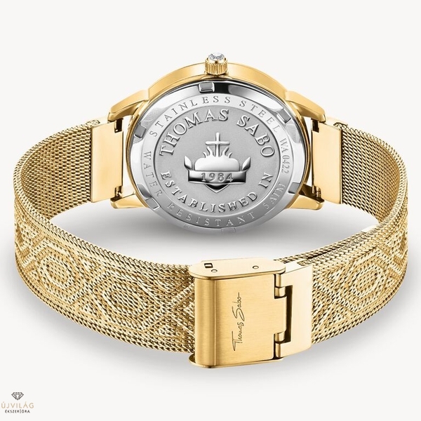 A SPIRIT MAGIC GARDEN női karóra rendkívüli megjelenése, jellegzetes fekete-arany színkombinációjával mindenki figyelmét magára vonzza. Az ikonikus THOMAS SABO szitakötő motívummal díszített karóra fehér cirkóniakövekkel és fenséges, arany színű szitakötőkkel büszkélkedhet. A fekete számlapon található motívum ezüst mutatókkal kaleidoszkópra emlékeztet. Az arany színű óra rozsdamentes acélból készült, a kereten THOMAS SABO felirattal, a koronán pedig cabochon vágású kövekkel díszítve. A karkötő finom milánói kialakítású, grafikus THOMAS SABO mintával. A csúszó zárnak köszönhetően hossza állítható, így a csuklóhoz igazítható.