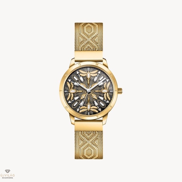 Arany színű női karóra, 33 mm-es, szitakötőkkel és cirkóniával