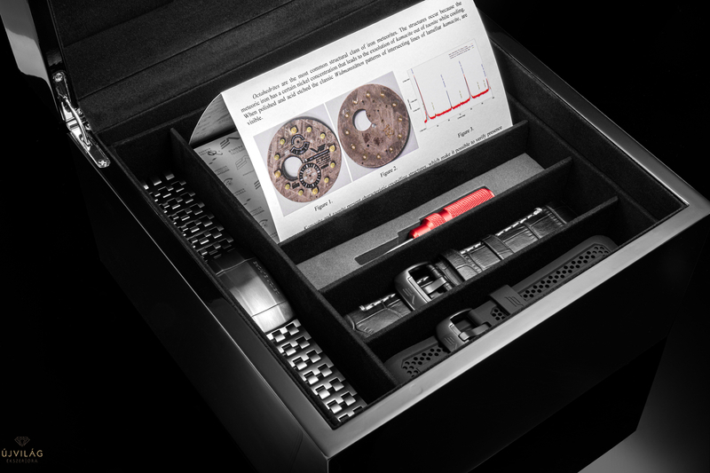 Az óra, tartozékai, valamint többek között a garancia, a Litván Állami Kutatóintézet Fizikai Tudományok és Technológia Központjától jóváhagyott meteorit tanúsítvány, a vízállóság jóváhagyása és a tisztító kendő két külön szinten helyezkednek el az extravagáns dobozban.