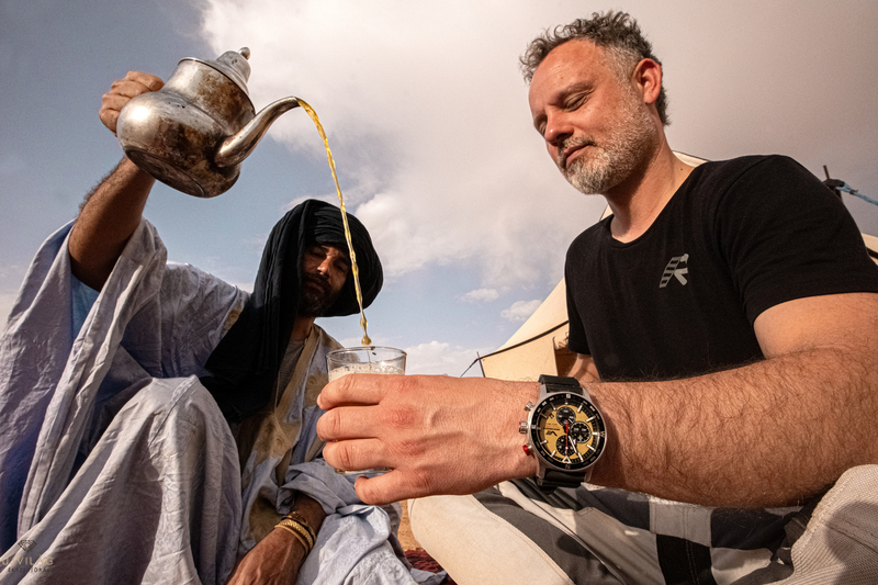 A tervezés színpalettája a Szaharát tükrözi: a sivatagi táj meleg, homokos árnyalatai kontrasztot alkotnak a mély fekete akcentussal, amely a tuaregek hagyományos ruházatának tisztelgése. A tok homokfúvott és csiszolt felülete a szél és a homok által formált felületeket idézi. Ugyanakkor a robusztus konstrukció 20 bar por- és vízállóságot biztosít, védve a sivatagi viharok, a hőség és a szélsőséges körülmények ellen. Minden csomagban két szíj található: a fekete szilikon szíj kényelmes, ellenálló és aktív használatra alkalmas extrém körülmények között, míg a textil szíj a hagyományos anyagokhoz való kapcsolódást és a sivatag ihlette dizájnt kiegészítő robusztus esztétikát kínál. Ez a kombináció lehetővé teszi a viselők számára, hogy órájukat mind funkcionális expedíciókhoz, mind mindennapi viselethez igazítsák.